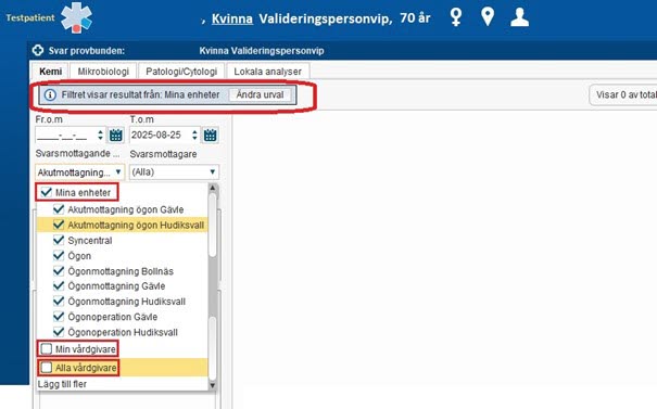 Det är viktigt att känna till att det fortfarande är möjligt att se provsvar från andra enheter, genom att välja "Min vårdgivare" eller "Alla vårdgivare" i systemet.